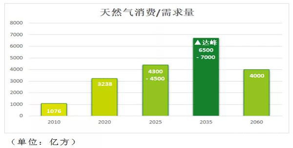 過去十年,國內天然氣消費量從2010年的1076億方,增長到2020年的3238億方,占能源消費總量比例連年遞增。據中國石油規劃總院預測,2025年全國天然氣需求約在4300-4500億方;2035年天然氣需求達峰,約6500-7000億方,隨后需求下降,最終在2060年降為4000億左右。